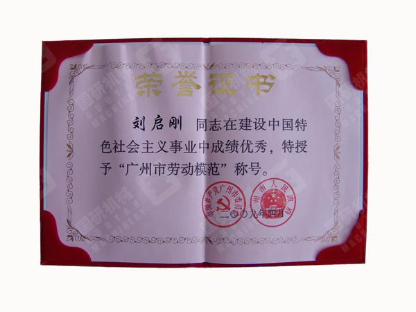 廣州市委、市政府授予劉啟剛同志廣州市勞動模范榮譽(yù)證書