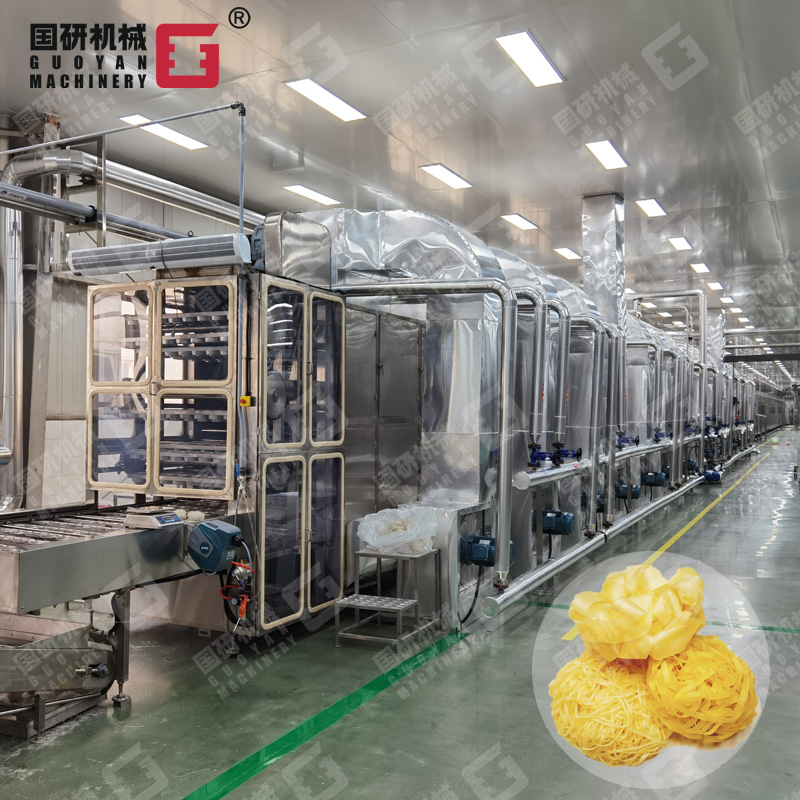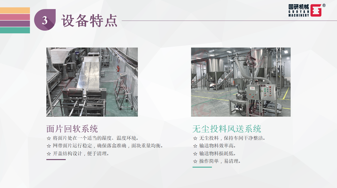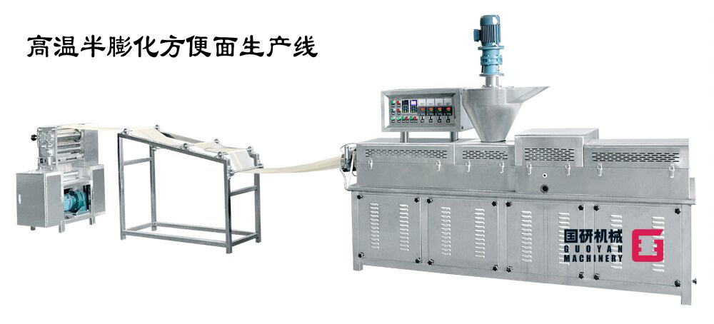 高溫半膨化非油炸方便面生產(chǎn)線,是集自動(dòng)和面、自動(dòng)加料、擠壓膨化、面片冷卻輸送、自動(dòng)切條、分行輸送自動(dòng)提升、加濕回軟切斷、自動(dòng)落盒成形、自動(dòng)干燥到成品輸送入包裝于一體的全自動(dòng)生產(chǎn)線。該設(shè)備主要應(yīng)用于擠出式非油炸快食面的生產(chǎn),工藝流暢、功能齊全、自動(dòng)化程度高,機(jī)器出品穩(wěn)定,工藝技術(shù)強(qiáng)于國(guó)內(nèi)同類生產(chǎn)設(shè)備,是油炸方便面廠家更新?lián)Q代的理想選擇。